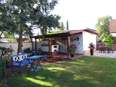 ○ im Außenbereich lädt eine Terrasse mit Grill bei schönem Wetter ein
